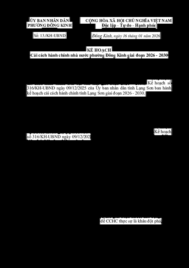 | Tiêu đề văn bản | Kế hoạch số 13/KH-UBND ngày 16 tháng 01 năm 2026 của UBND phường Đông Kinh, tỉnh Lạng Sơn | ||