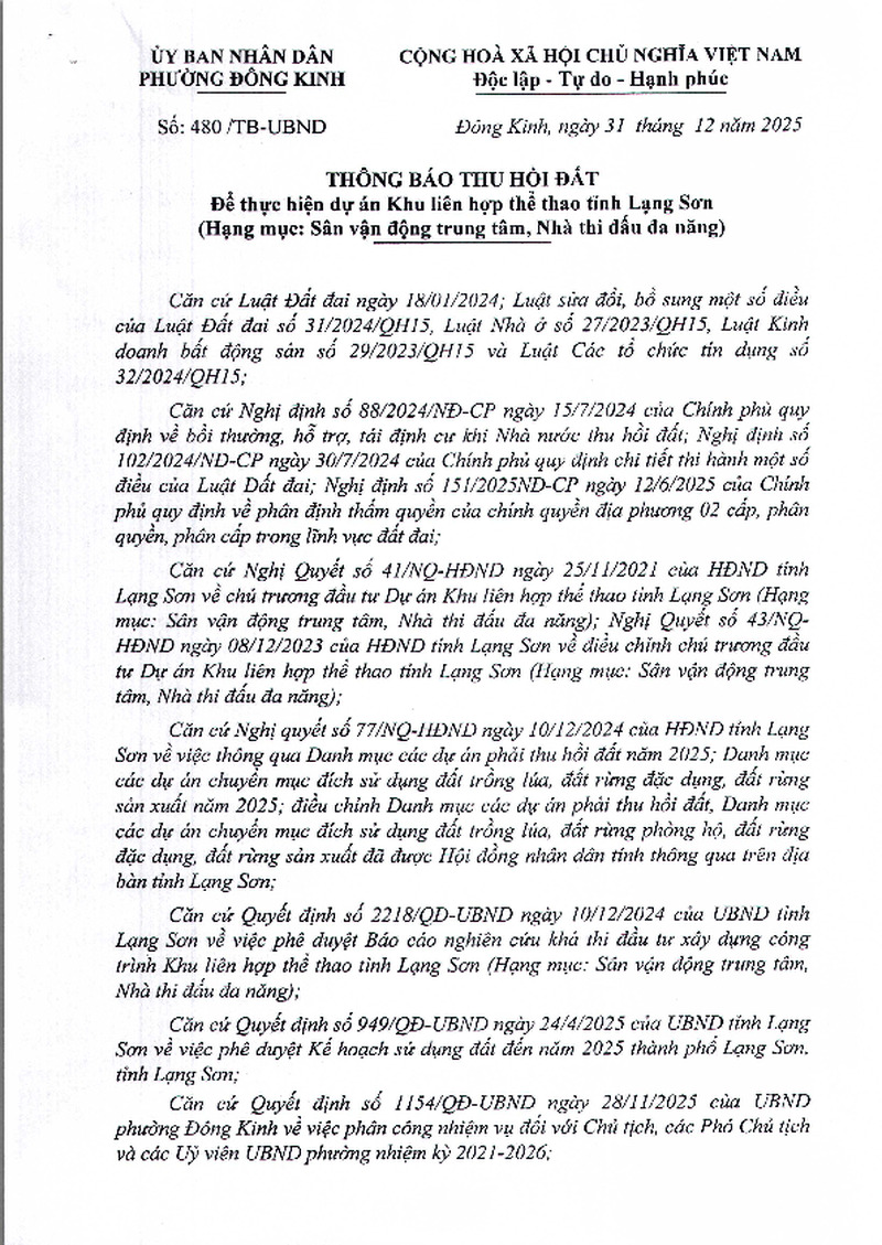 2. Lý do thu hồi đất: Để thực hiện dự án Khu liên hợp thể thao tỉnh Lạng Sơn (Hạng mục: Sân vận động trung tâm , Nhà thi đấu đa năng).
