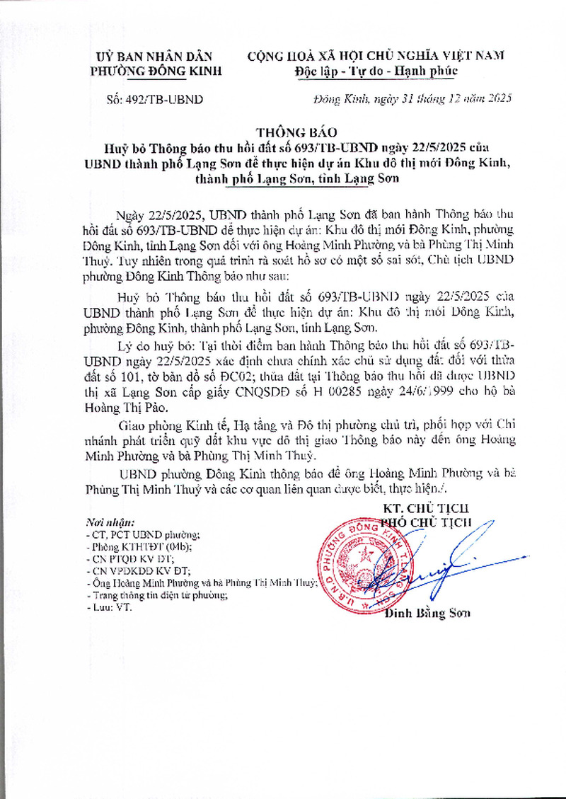 Huỷ bỏ Thông báo thu hồi đất số 693/TB-UBND ngày 22/5/2025 của UBND thành phố Lạng Sơn để thực hiện dự án Khu đô thị mới Đông Kinh, phường Đông Kinh, Thành Phố Lạng Sơn, tỉnh Lạng Sơn