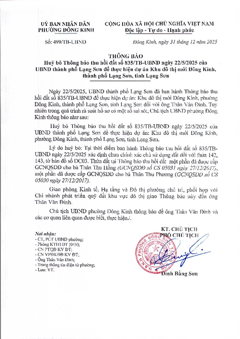 Huỷ bỏ Thông báo thu hồi đất số 835/TB-UBND ngày 22/5/2025 của UBND thành phố Lạng Sơn để thực hiện dự án Khu đô thị mới Đông Kinh, phường Đông Kinh, Thành Phố Lạng Sơn, tỉnh Lạng Sơn.