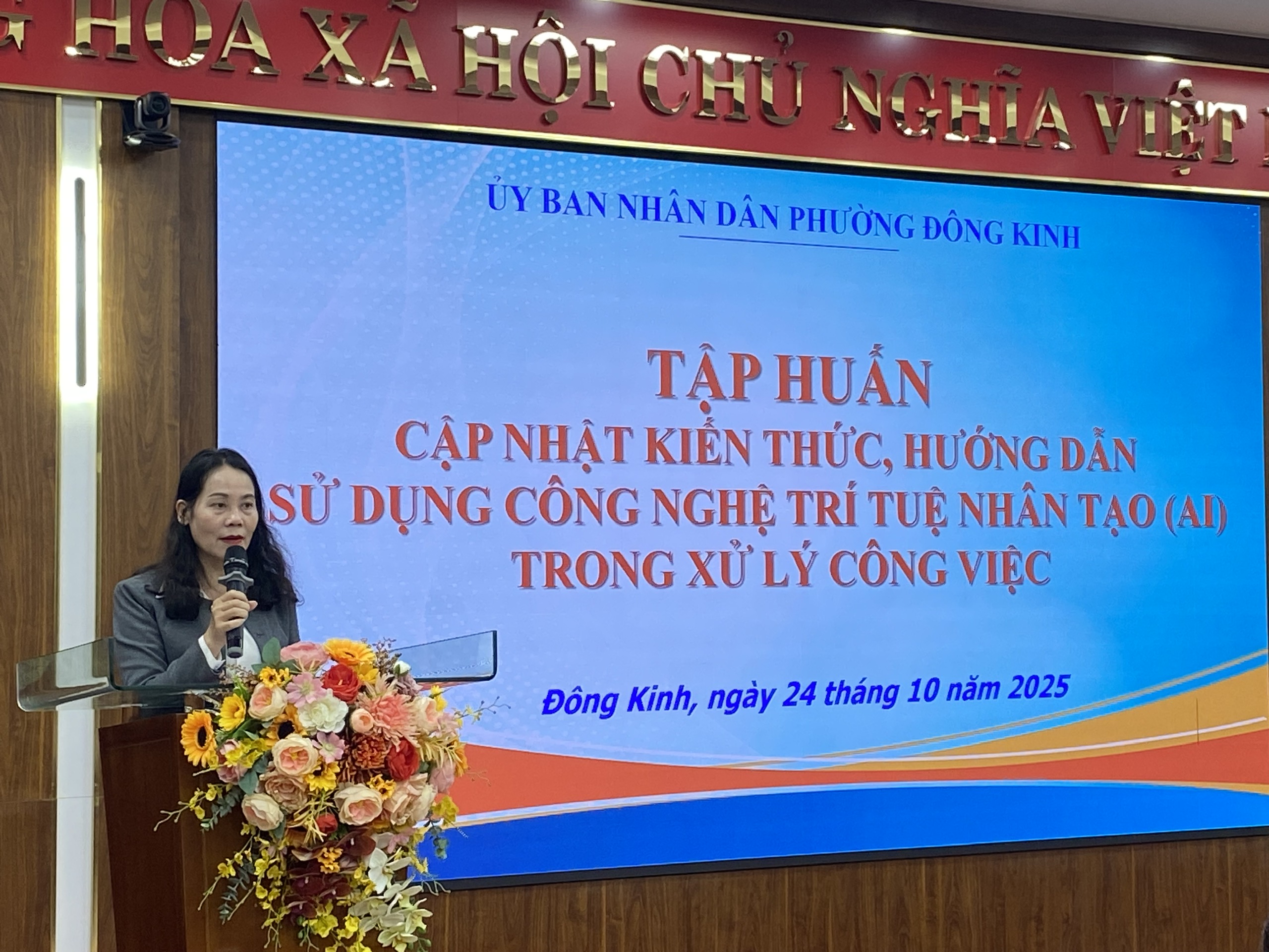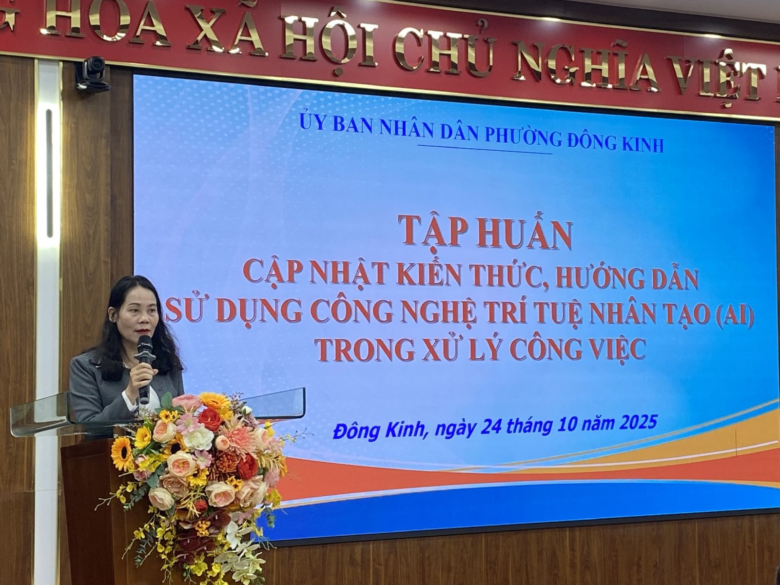 Ngày 24/10/2025, phường Đông Kinh phối hợp với Trung tâm Chuyển đổi số, thuộc Sở Khoa học và Công nghệ tỉnh Lạng Sơn tổ chức Kế hoạch tập huấn, cập nhật kiến thức, hướng dẫn sử dụng công nghệ trí tuệ nhân tạo (AI) trong xử lý công việc, với hơn 160 cán bộ, công chức, viên chức tham dự chương trình.