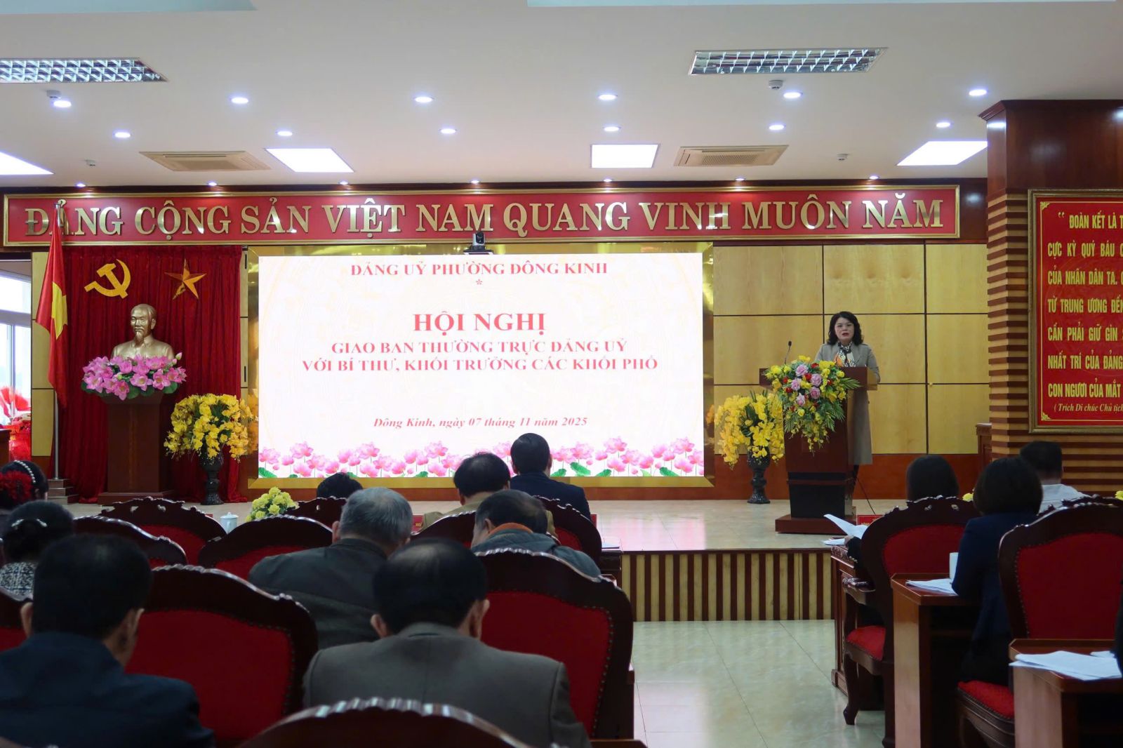 Chiều ngày 07/11/2025, tại Hội trường tầng 5 – Trụ sở Đảng ủy phường Đông Kinh, Thường trực Đảng ủy phường tổ chức Hội nghị giao ban với Bí thư, Khối trưởng các khối phố nhằm đánh giá kết quả thực hiện nhiệm vụ 10 tháng đầu năm, thảo luận phương hướng, nhiệm vụ trọng tâm 2 tháng cuối năm 2025 và xem xét, giải quyết các kiến nghị, đề xuất từ cơ sở.