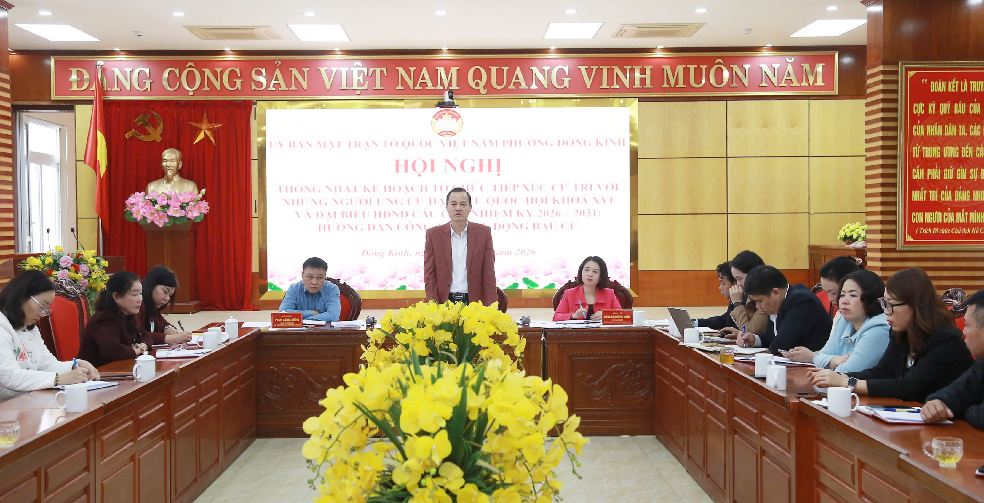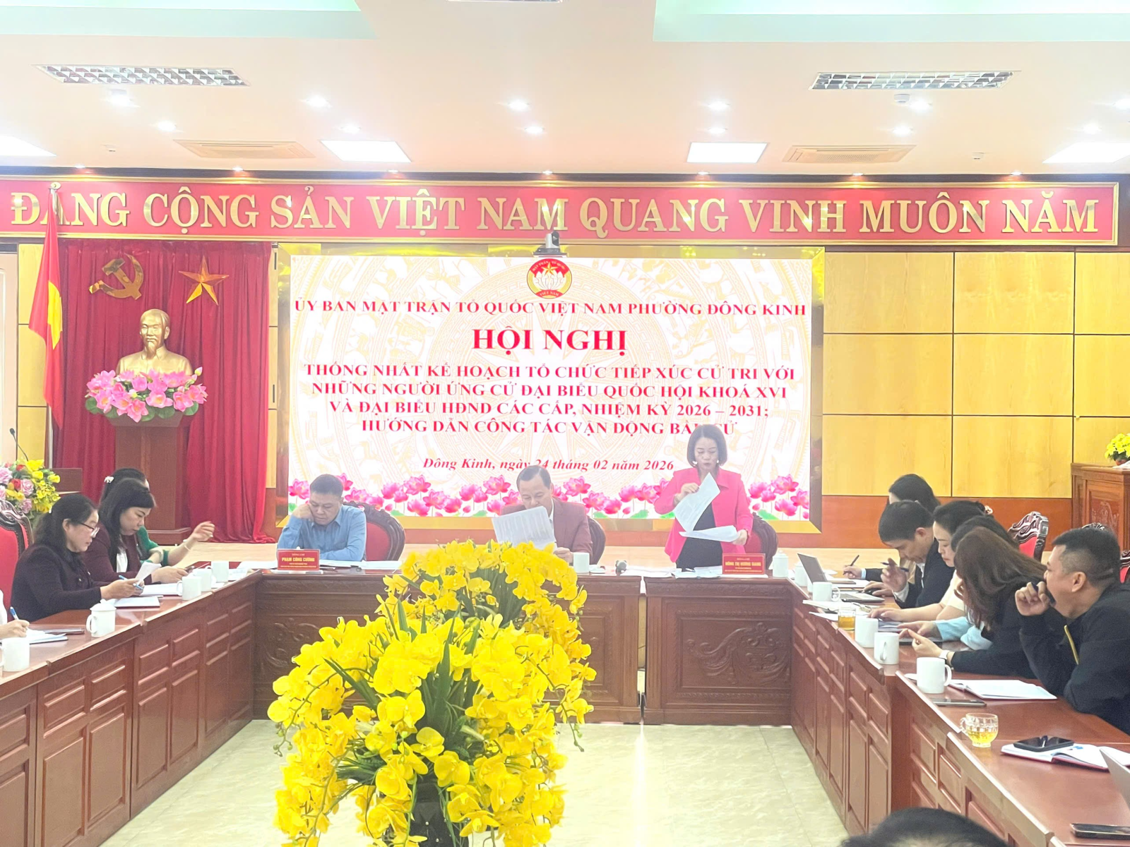 Sáng ngày 24/02, Ủy ban Mặt trận Tổ quốc Việt Nam phường Đông Kinh đã tổ chức Hội nghị thống nhất kế hoạch tổ chức hội nghị tiếp xúc giữa cử tri với những người ứng cử đại biểu Quốc hội khóa XVI, đại biểu Hội đồng nhân dân các cấp nhiệm kỳ 2026 - 2031; hướng dẫn công tác vận động bầu cử. Đồng chí Nông Thị Hương Giang - Ủy viên Ban Thường vụ Đảng ủy, Chủ tịch Ủy ban MTTQ Việt Nam phường chủ trì buổi làm việc.