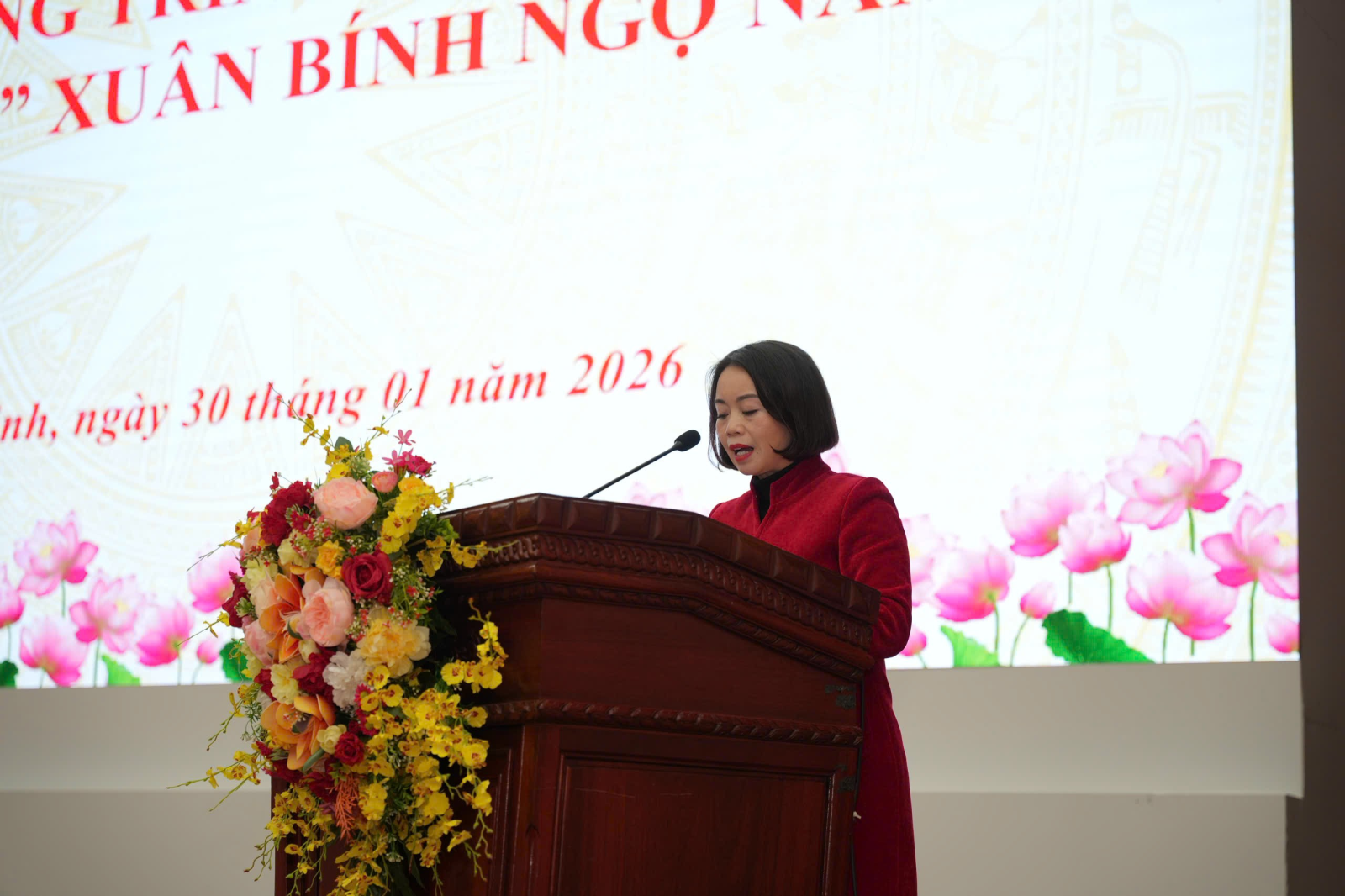 Đ/c Nông Thị Hương Giang, Ủy viên BTV Đảng ủy, Chủ tịch Uỷ ban MTTQ Việt Nam phường phát biểu tại chương trình