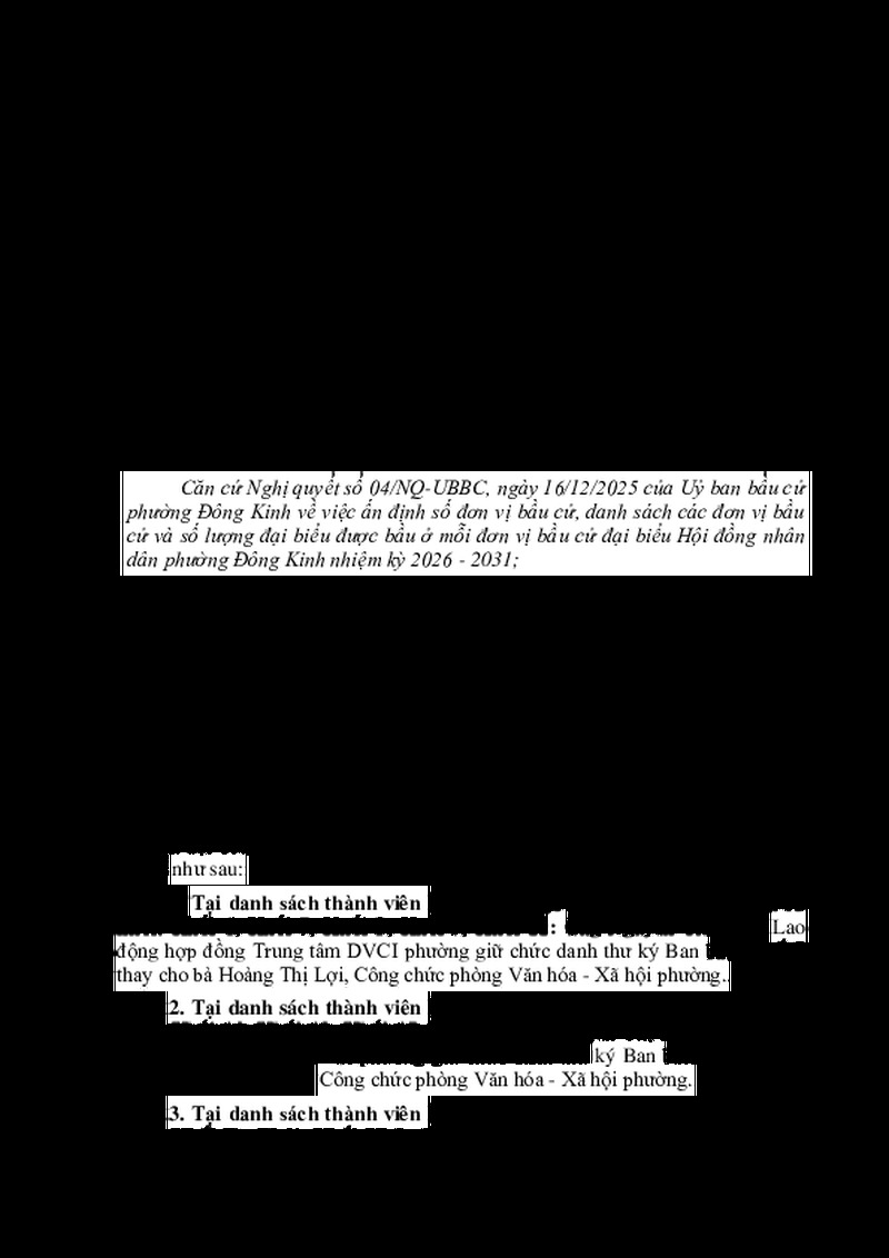 Về việc điều chỉnh thành viên Ban bầu cử đại biểu Quốc hội khóa XVI và đại biểu Hội đồng nhân dân phường Đông Kinh nhiệm kỳ 2026 - 2031 (Ban bầu cử số 2, số 3, số 5, số 6, số 7)